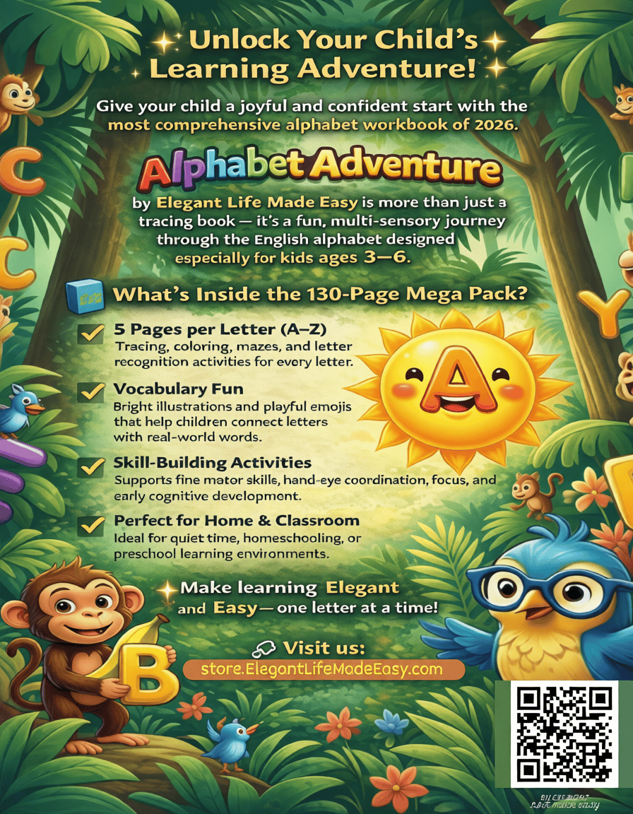 Unlock your child's potential with Alphabet Adventure by Elegant Life Made Easy. This 130-page printable mega-pack is designed to turn early education into a fun, multi-sensory journey. Far more than just a tracing book, it’s a comprehensive tool built to sharpen fine motor skills and boost cognitive focus.