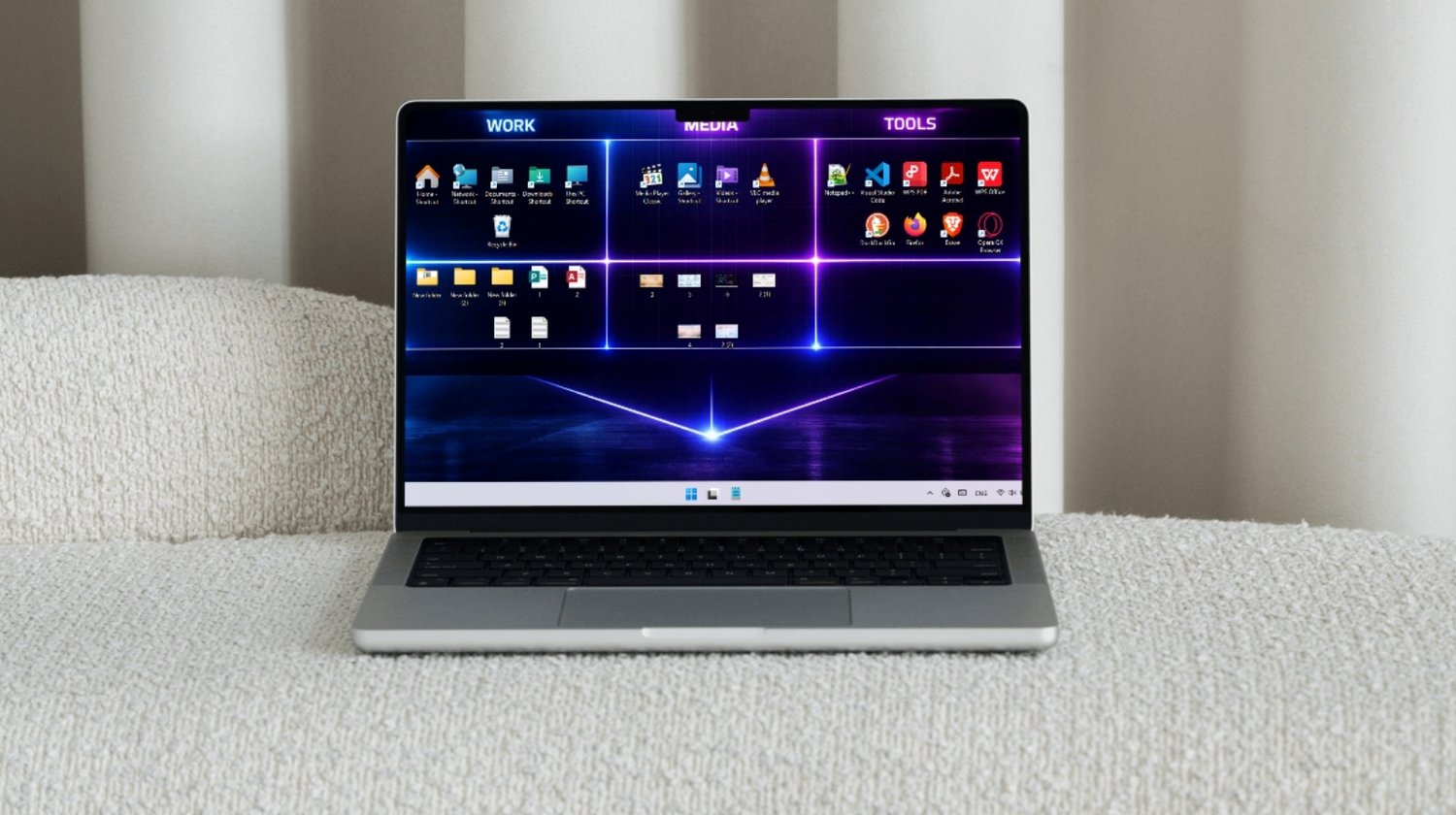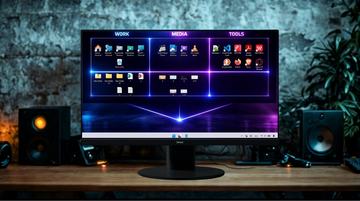 Boost your productivity with this futuristic neon desktop wallpaper designed to keep your Work, Media, and Tools visually organized in a modern cyber-style layout.