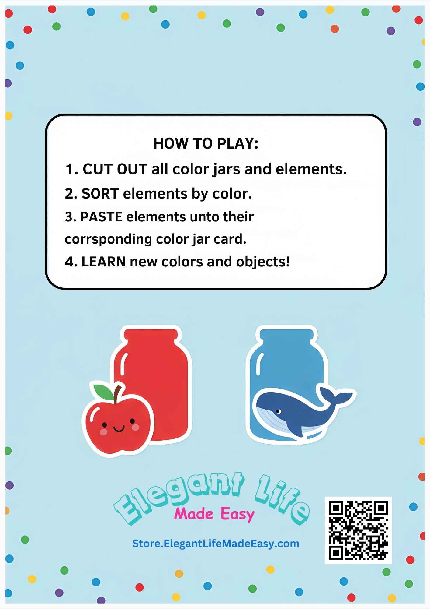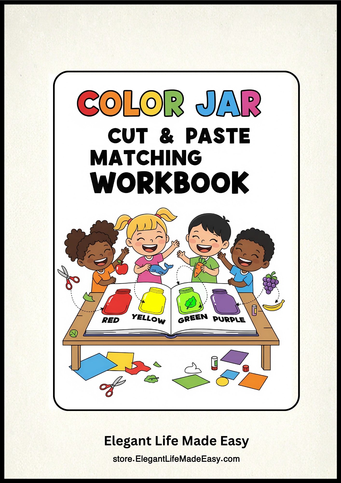 Through the classic "Cut and Paste" method, children will match colorful objects to their corresponding 12 themed jars, helping them develop essential early childhood skills in an interactive way.
